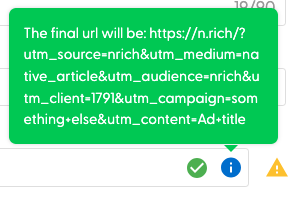 While the yellow warning icon, present both on the call-to-action popup and the right side of the body formatting area represent a N.Rich tag check of the underlying link: