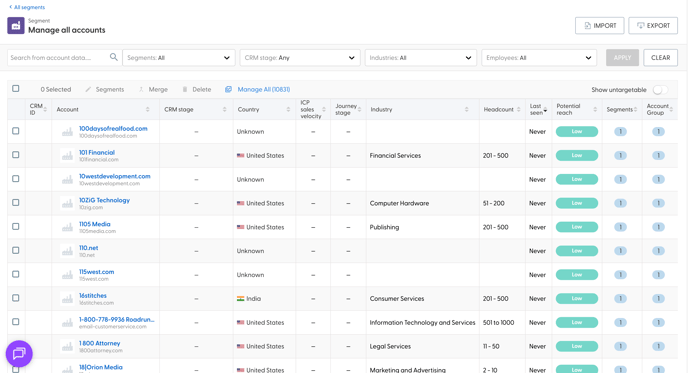 This view has no options to sync or delete individual segments, as what we are seeing are accounts belonging to all segments (and this stands even if you filter down to a single segment using this view)